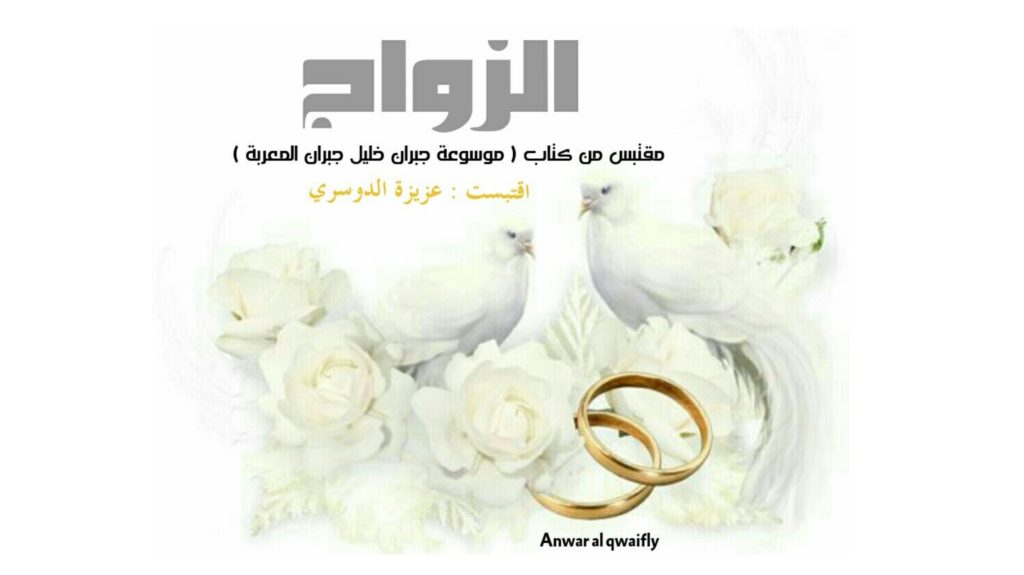 ثم قالت له المطرة ثانية : ومارأيك في الزواج أيها المعلم؟ فأجاب قائلا : لقد ولدتم معا، وستظلون معاإلى الأبد. وستكونون معا عندما تبدد أيامكم أجنحة الموت البيضاء، أجل، وستكونون معا حتى في سكون تذكارات الله . ولكن فليكن بين وجودكم معا فسحات تفصلكم بعضكم عن بعض حتى ترقص أرياح السماوات فيما بينكم، أحبوا …